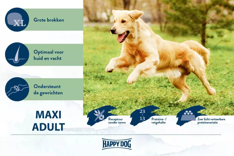 Happy Dog fit & vital Maxi Adult is perfect afgestemd op de behoeften van volgroeide, grote honden vanaf 26 kg. De evenwichtige en lekkere totaalvoeding is gebaseerd op het unieke Happy Dog Natural Life Concept® en is verrijkt met waardevolle Nieuw-Zeelandse mossel ter ondersteuning van de gewrichten. Belangrijke omega-3 en omega-6 vetzuren zijn goed voor huid en vacht. Happy Dog fit &vital maxi Adult heeft bovendien een receptuur zonder tarwe en bestaat uit XL brokken die afgestemd zijn op het gebit van grotere honden. (Happydog.nl)